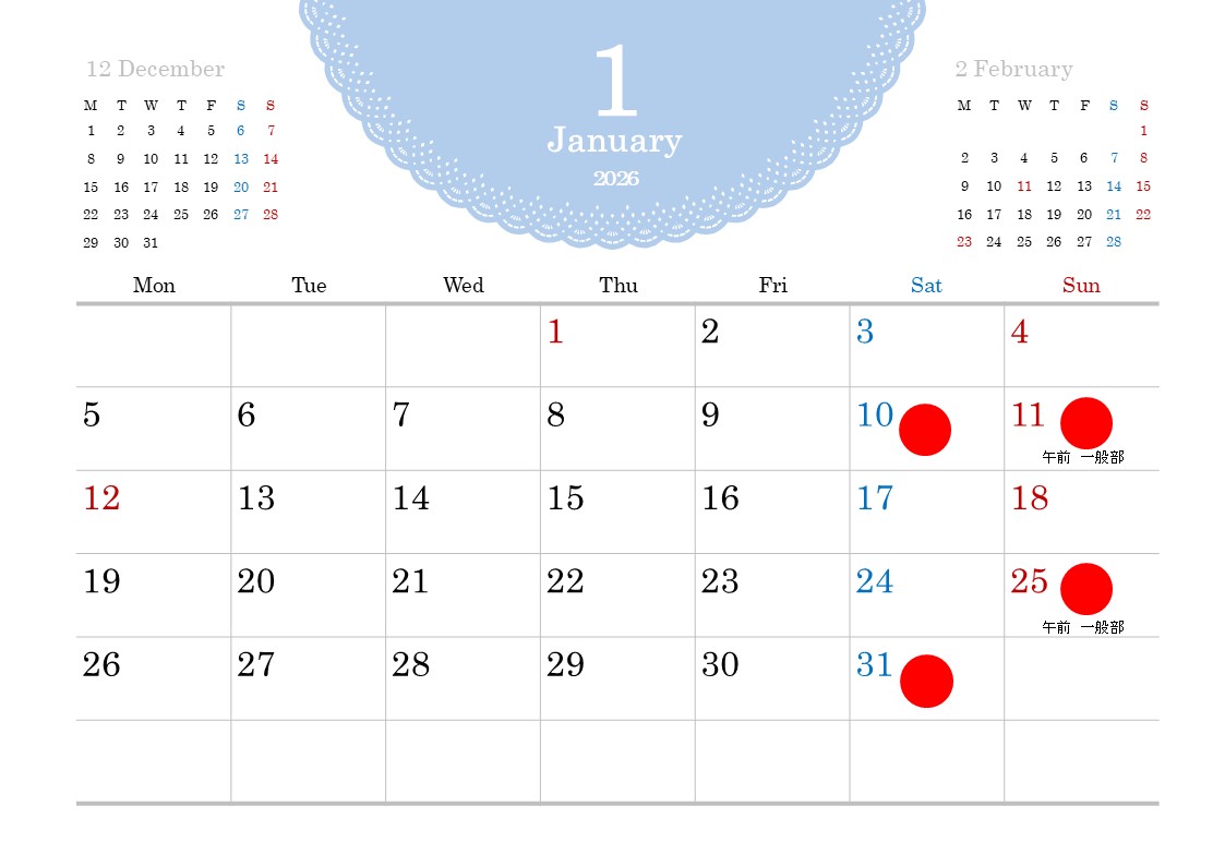 カレンダーの赤マルの付いている日が、家泉書道教室のお稽古日です。無料体験・見学が出来ますのでお気軽にご参加ください。
